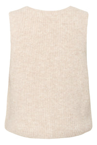 A beige knitted vest with ribbed texture and deep V-neckline. Designed with front button closure and a soft, slightly cropped fit. The model is 179 cm tall and is wearing a size S.